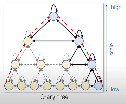 연결된 이웃 $\mathbb{N}_ℓ^{(s)}$은 같은 층의 이웃 A개 ($\mathbb{A}_ℓ^{(s)}$), 아래층의 자식 C개 ($\mathbb{C}_ℓ^{(s)}$), 위층의 부모 1개 ($\mathbb{P}_ℓ^{(s)}$) 가 있다.